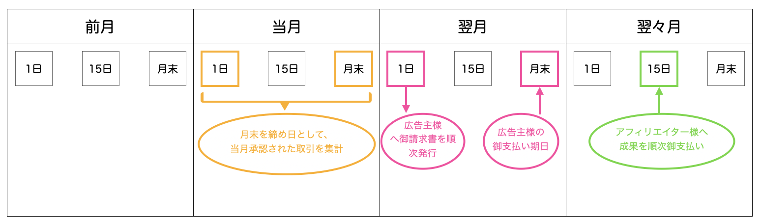 - 当社は、毎月の末日までに承認された成果の報酬について、翌々月の15日にアフィリエイターに振込の方法により支払いを行うものとする。ただし、成果報酬の支払日である15日が金融機関の休日にあたる場合は翌営業日を支払日とする。広告主様へのご利用料金のご請求およびアフィリエイターへの入金スケジュールを下図に示す。